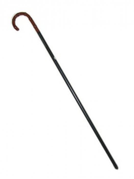 De wandelstok is van zwart plastic met een bruin hand gedeelte.