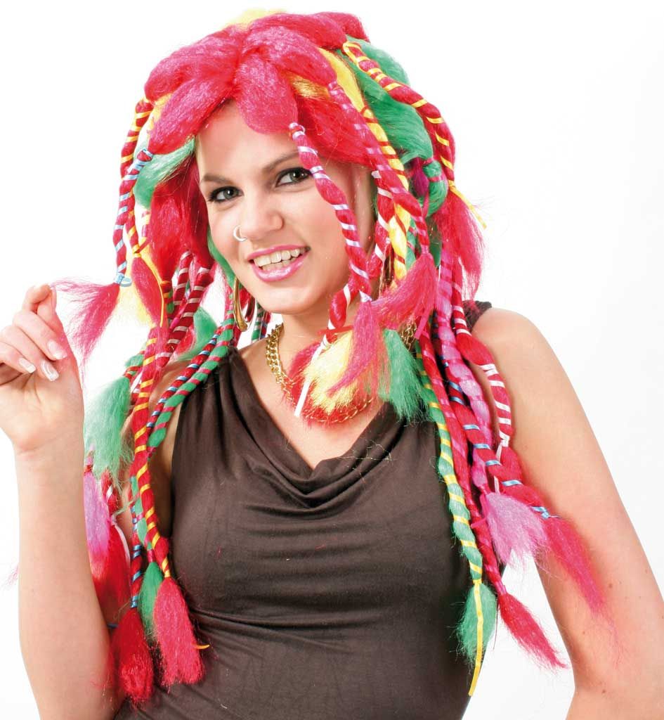 Val op met deze kleurrijke rasta pruik vol speelse details! Deze opvallende pruik heeft lange vlechten en losse plukken in felle kleuren zoals rood, groen, geel en roze. De combinatie van dreadlocks, touwtjes en franjes zorgt voor een unieke en feestelijke uitstraling.