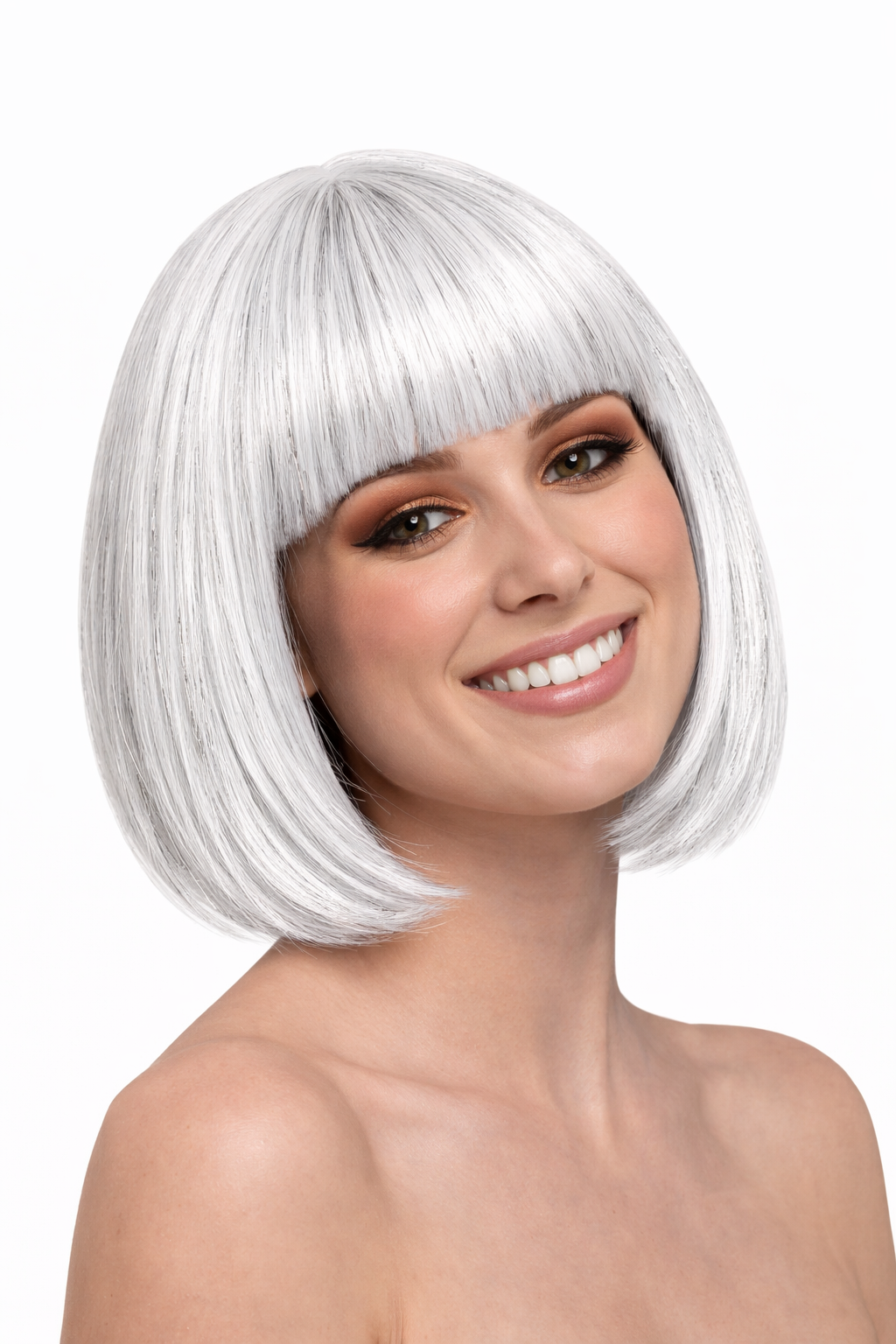 Ga voor een stijlvolle en frisse look met deze witte boblijn pruik met subtiele zilveren haren. De strakke boblijn met rechte pony zorgt voor een moderne en verzorgde uitstraling, terwijl de fijne zilveren accenten een luxe en verfijnd effect geven.