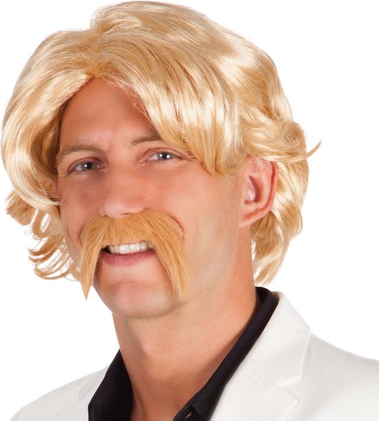 Ga voor een opvallende retro look met de pruik Chuck blond inclusief snor. Deze herenpruik heeft een halflang kapsel met volume en een bijpassende blonde snor, wat zorgt voor een stoere en herkenbare uitstraling.
