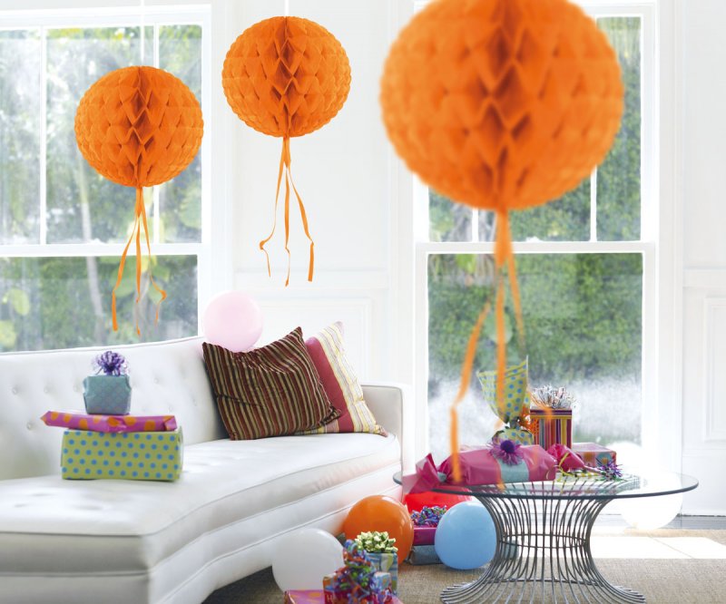 Deze honeycomb bal oranje is van papier gemaakt en heeft een diameter 30cm.
