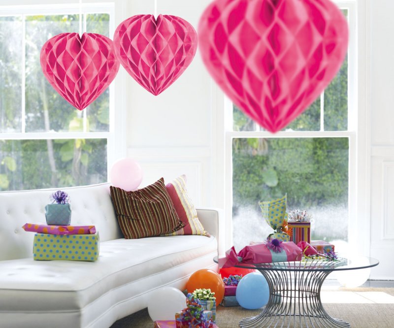 Deze honeycomb hart roze is van papier gemaakt en heeft een diameter 30cm.