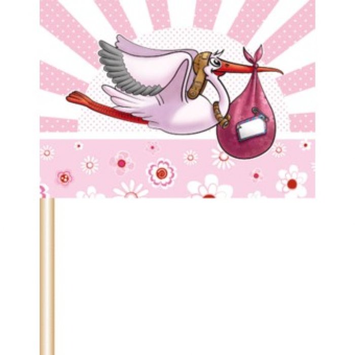 Omschrijving: Vlagprikker geboorte meisje met afbeelding ooievaar 50 stuks cocktailprikkers