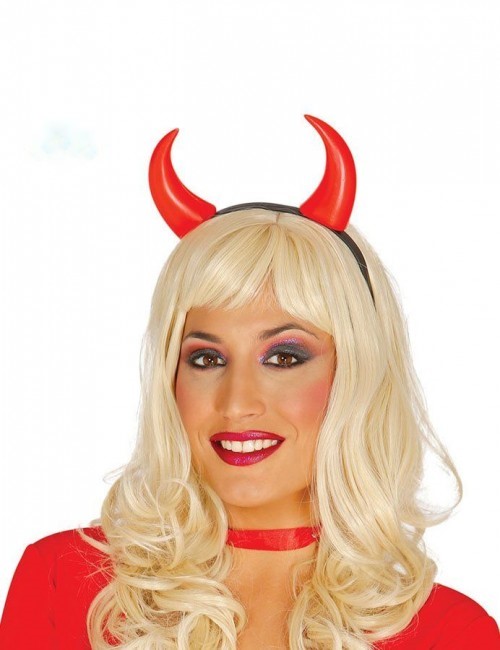 Duivelshoorn op diadeem, de diadeem is van zwart plastic met rode plastic hoorntjes