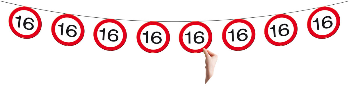 16 jaar slinger verkeersbord is een slinger van 12 meter lang met 15 hangende verkeersborden met daarin het getal 16. Deze slinger is natuurlijk hartstikke leuk voor een 16 jarig feest en maakt het net wat persoonlijker.