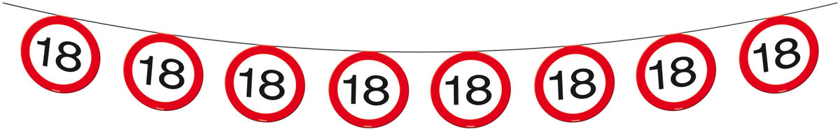 18 jaar slinger verkeersbord is een slinger van 12 meter lang met 15 hangende verkeersborden met daarin het getal 18.Deze slinger is natuurlijk hartstikke leuk voor een 18 jarig feest en maakt het net wat persoonlijker.