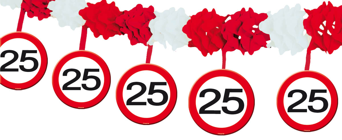 25 jaar verkeersbord slinger deze slinger is 4 meter lang en heeft 12 onderhanger verkeersborden met daarin het getal 25. Deze slinger is natuurlijk hartstikke leuk voor een 25 jarig feest en maakt het net wat persoonlijker.