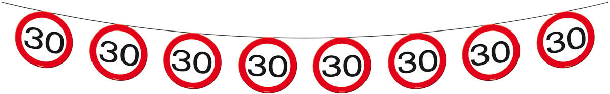 De 30jaar slinger verkeersbord is een slinger van 12 meter lang met 15 hangende verkeersborden met daarin het getal 30. Deze slinger is natuurlijk hartstikke leuk voor een 30 jarig feest en maakt het net wat persoonlijker.
