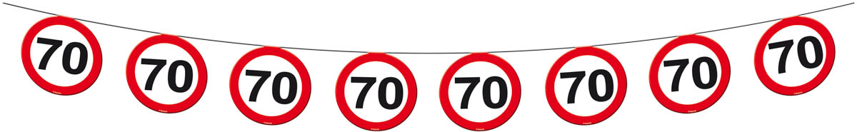 70 jaar slinger verkeersbord is een slinger van 12 meter lang met 15 hangende verkeersborden met daarin het getal 70. Deze slinger is natuurlijk hartstikke leuk voor een 70 jarig feest en maakt het net wat persoonlijker.
