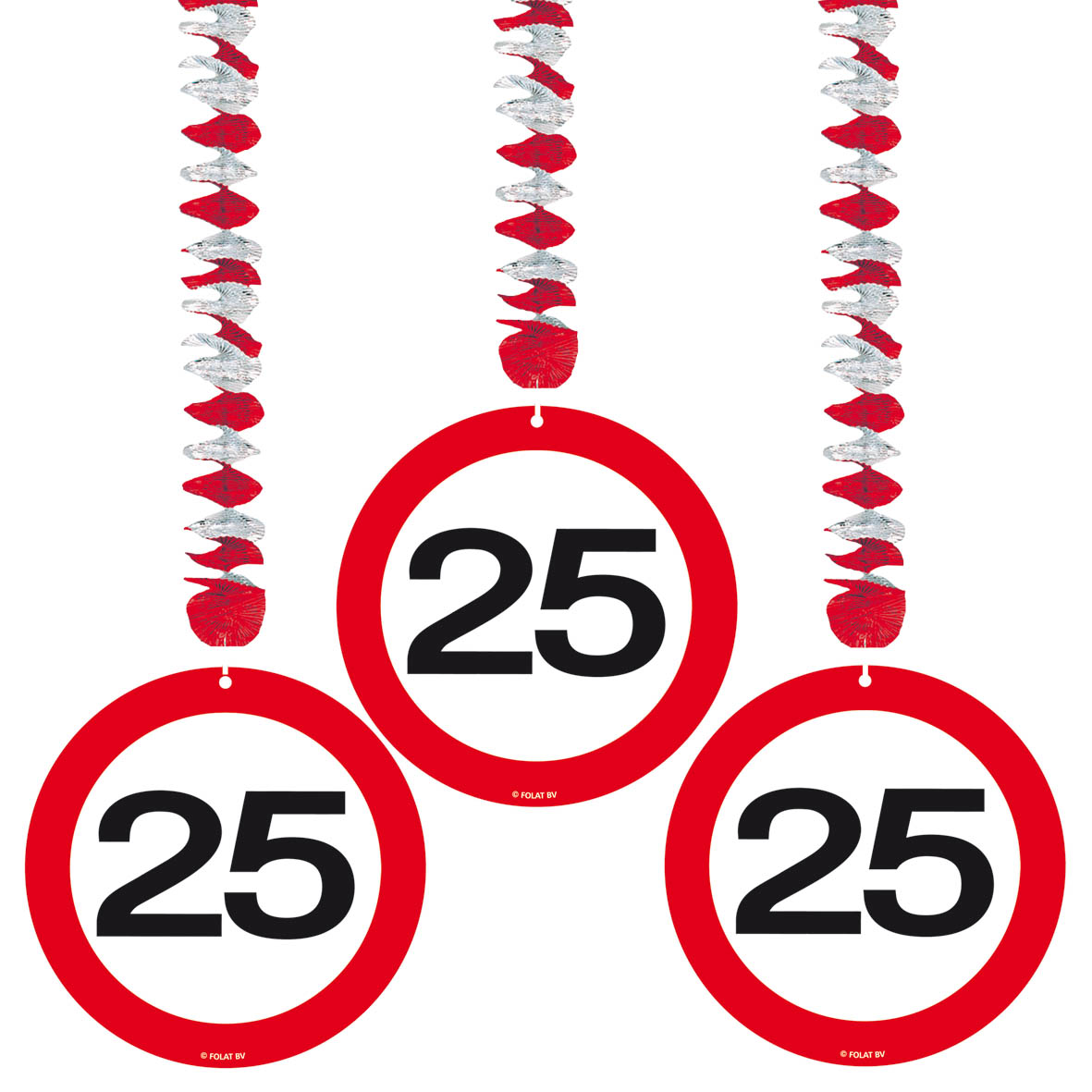 Deze hangdecoratie is een slinger met daaraan een verkeersbord met daarin het cijfer 25.