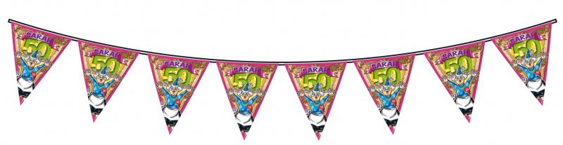 Voor een verjaardagsfeest van Sarah hebben we deze leuke dubbelzijdige vlaggenlijn, type stripes. De vlaggenlijn is bedrukt met een Sarah en het getal 50. De vlaggenlijn is 6 meter lang met 15 vlaggen